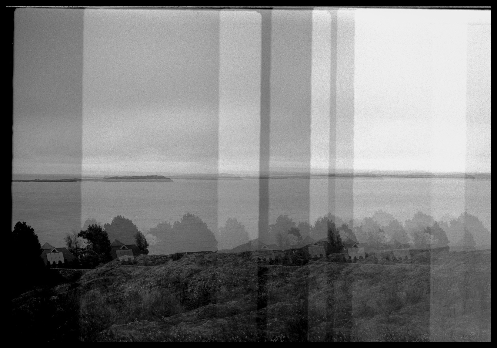 Yet another example of an accidental montage from the Olympus Pen which was not advancing the film properly. I took these shots while testing a series of filters (red, yellow, orange, blue x2, skylight, ND) on the same scene. The camera was handheld but I was trying to get the same framing with each shot so I could compare them easily. It ended up making a nice row of trees along the edge of the Strait of Juan de Fuca, and an archipelago of Trial Islands. I like how it came out, and would have liked it even more with more subdued vertical banding. And while the results are not at all useful as a filter test, had they worked out I would not have had something to show here.