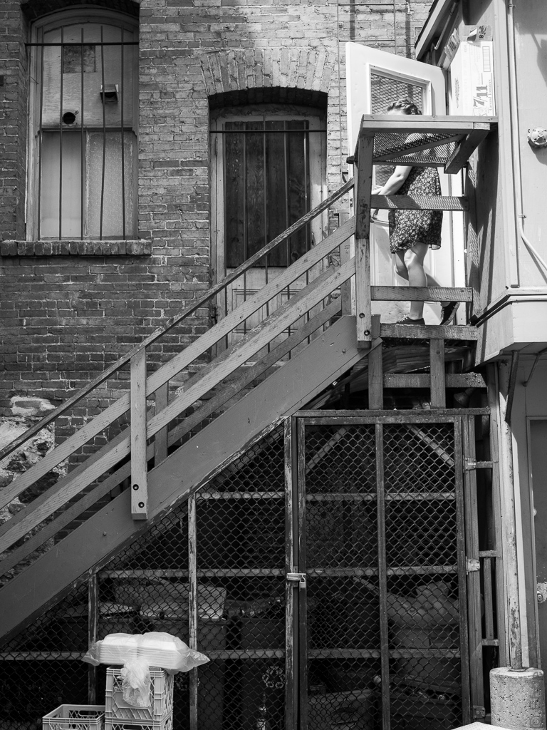 I was framing a second shot, after having taken the bottom one when the woman came out the door and into my photos. I did not have the guts to keep on photographing while she came down the stairs to fetch something, but we did have a brief chat – “what is so interesting that you would want to photograph it?” In fact, the truthful answer would have been her, going down and up the stairs, or at least would have added some interest. Still, I like how she is hidden and her actions suggested rather than obvious in the first shot.