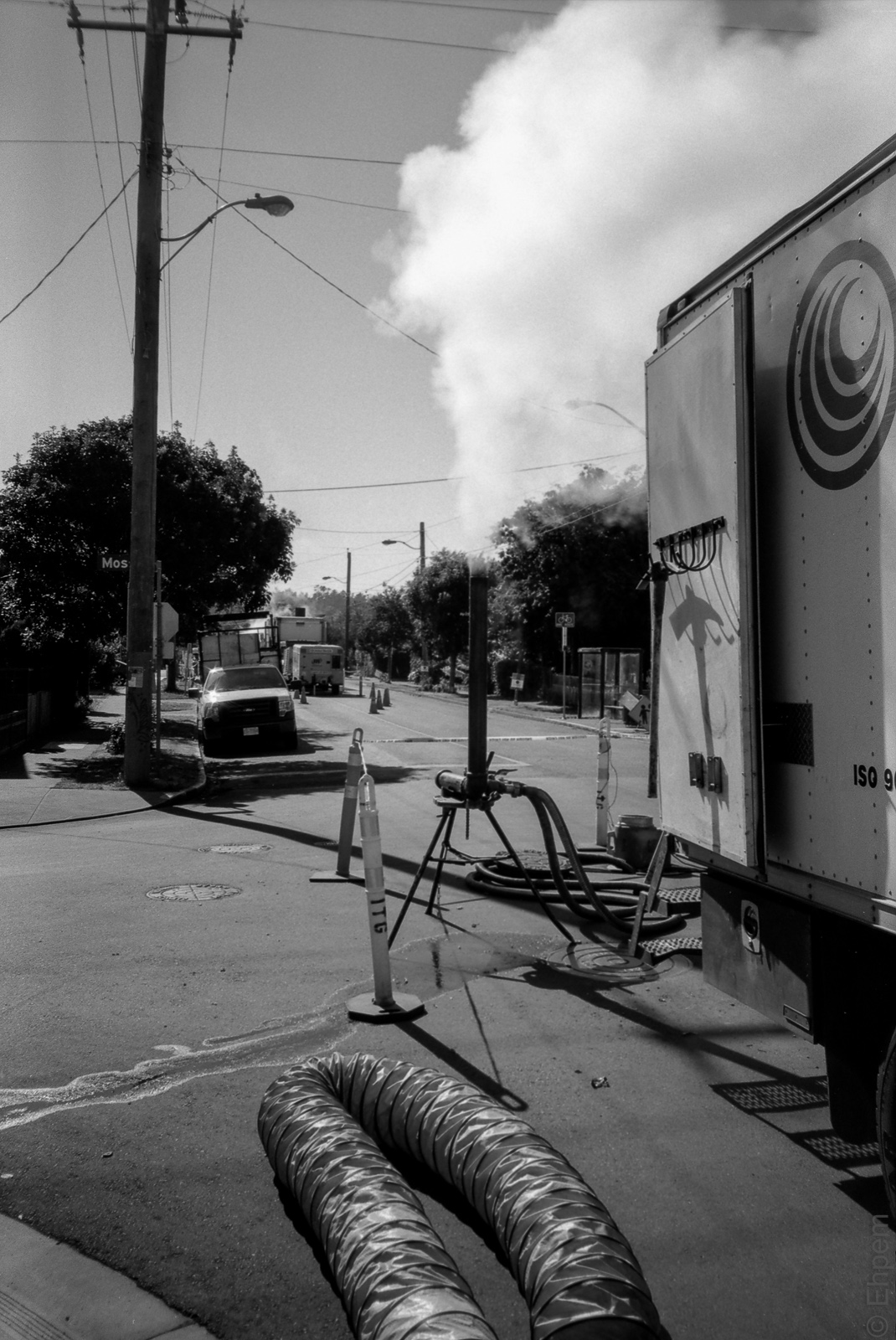 I thought I had missed this shot. About a year ago they were doing the steam curing of pipe linings at this same location and it was wonderfully lit. I did not have a camera with me. But, a few weeks ago, they were back at it, at the same location. This time I had a pocket film camera with me.