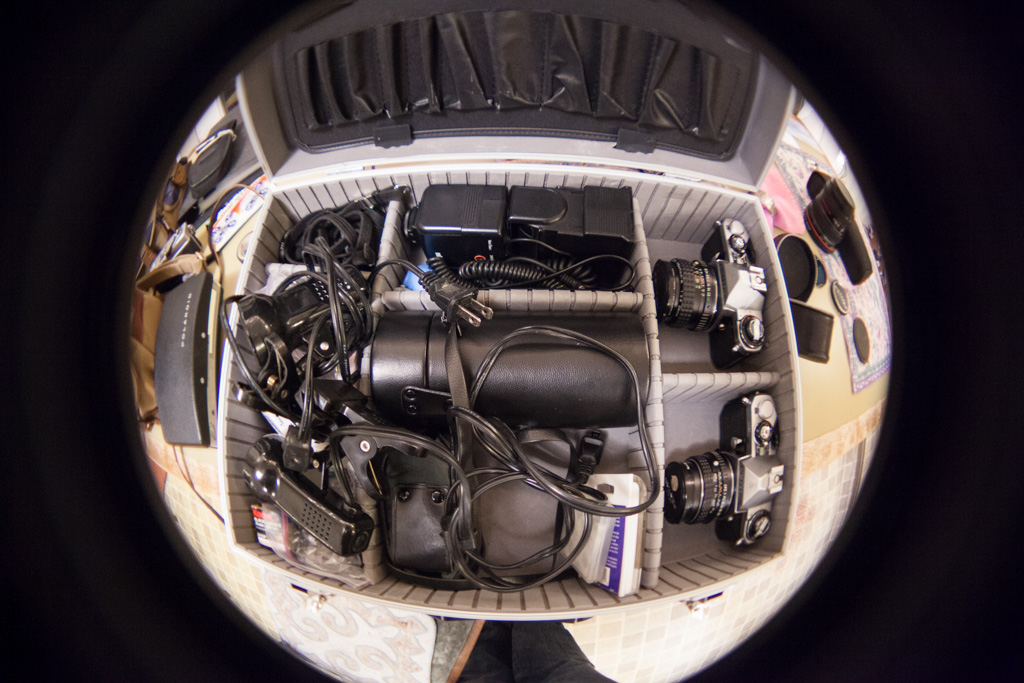 I infer from the kit that the camera was owned by a serious amateur who probably shot, or at least experimented with shooting portraits hence the two soft filters – given how expensive they are, there must have been serious intent. The 28mm lens also suggests an interest in landscape photography. The Izumanon fisheye attachment could mean any number of things (the top photo is taken with that lens mounted on one of my 35mm Takumars) – optically it is an appalling device, but might have some interesting artistic applications. There is a wide variety of negative film for both black and white and colour but much more variety, and more ‘serious’ black and white film which along with the red filter suggests a particular interest in b&w photography. What the lights with their very small incandescent bulbs might have been used for I am not sure – if there was a macro lens or attachment, that might explain it. The cameras show some signs of use on a tripod. Their straps were removed, including the strap clips. The wrist strap that screws into the tripod mounting hole suggests it might have been a substitute for neck straps though even then it would be hard to get out with both cameras. Perhaps only one camera was used at a time with a particular purpose in mind. The cameras and lenses show signs of use, but careful use in good conditions. The long zoom lens is like new and probably rarely used. One body had a 50mm lens mounted, the other had the 28 mounted.