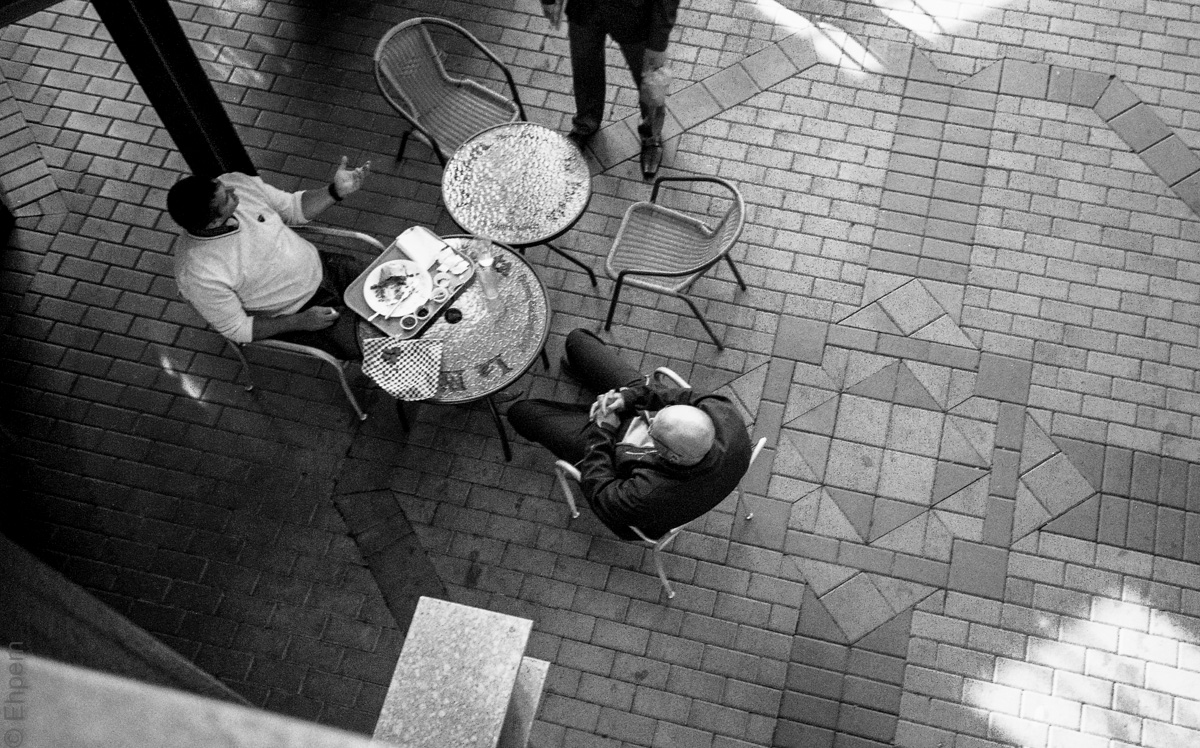 Thanks mithriluna! I actually stand very briefly at a balcony edge and take a quick picture, usually only one, as I feel self conscious about taking candid shots. I have to pass this way quite often and I can do it down at the cafe level, or take the stairs up and around a courtyard and then down next to these tables. I often go up and over, just in case a shot is waiting.