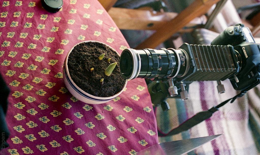 I changed subjects from the cherry bud to the young bulb shoot and did all the focusing through the 7N eyepiece, and set the shutter at 10 seconds, a compromise between the earlier DSLR reading of 8 seconds and the 7N reading of 15 seconds. I did not re-meter the scene, though should have as the bulb is a brighter subject. I increased the bracket to +/- 1.0 EV because by this time I had shot most of the film (I had wasted a few shots by forgetting to stop down after confirming focusing/framing) and did not have enough left to shoot at both the DSLR and 7N exposure readings.
