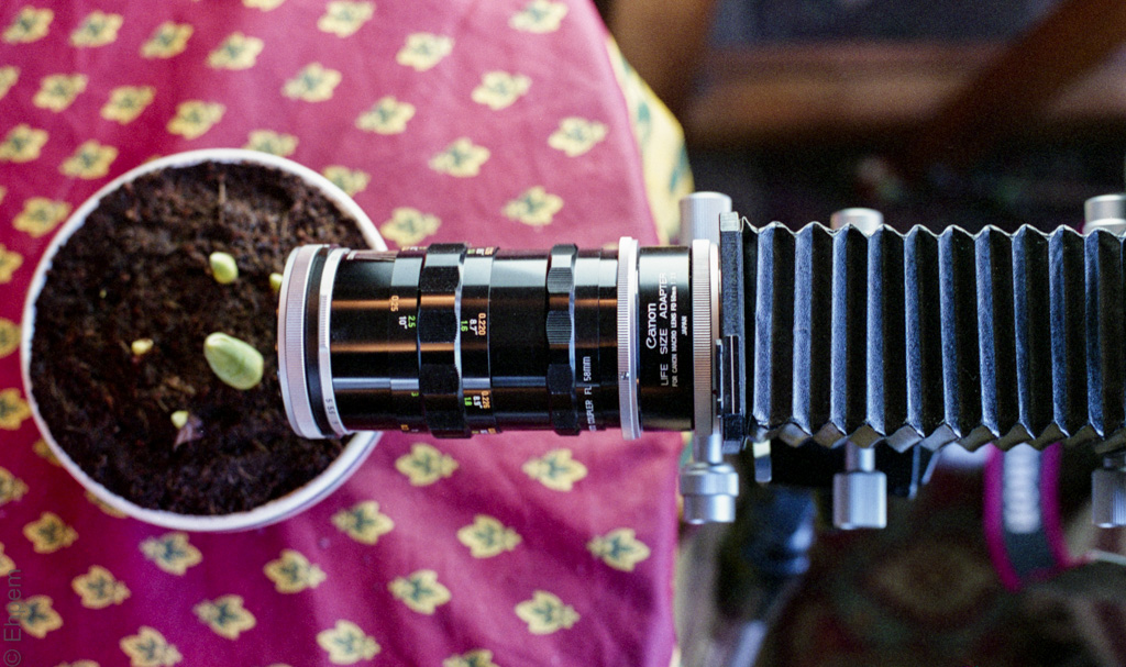 I mentioned in my first posts about the Canon Elan 7N (here and here) that I had chosen it so as to be able to shoot film with some of the lenses and accessories that I use on my Canon 5Dii DSLR. Since I have a rotten cold and don’t feel like getting out with any camera, I decided to use the 7N to shoot some high-magnification macro tests onto film set up at the table which I moved right next to the wood stove. Coddled myself, in other words.