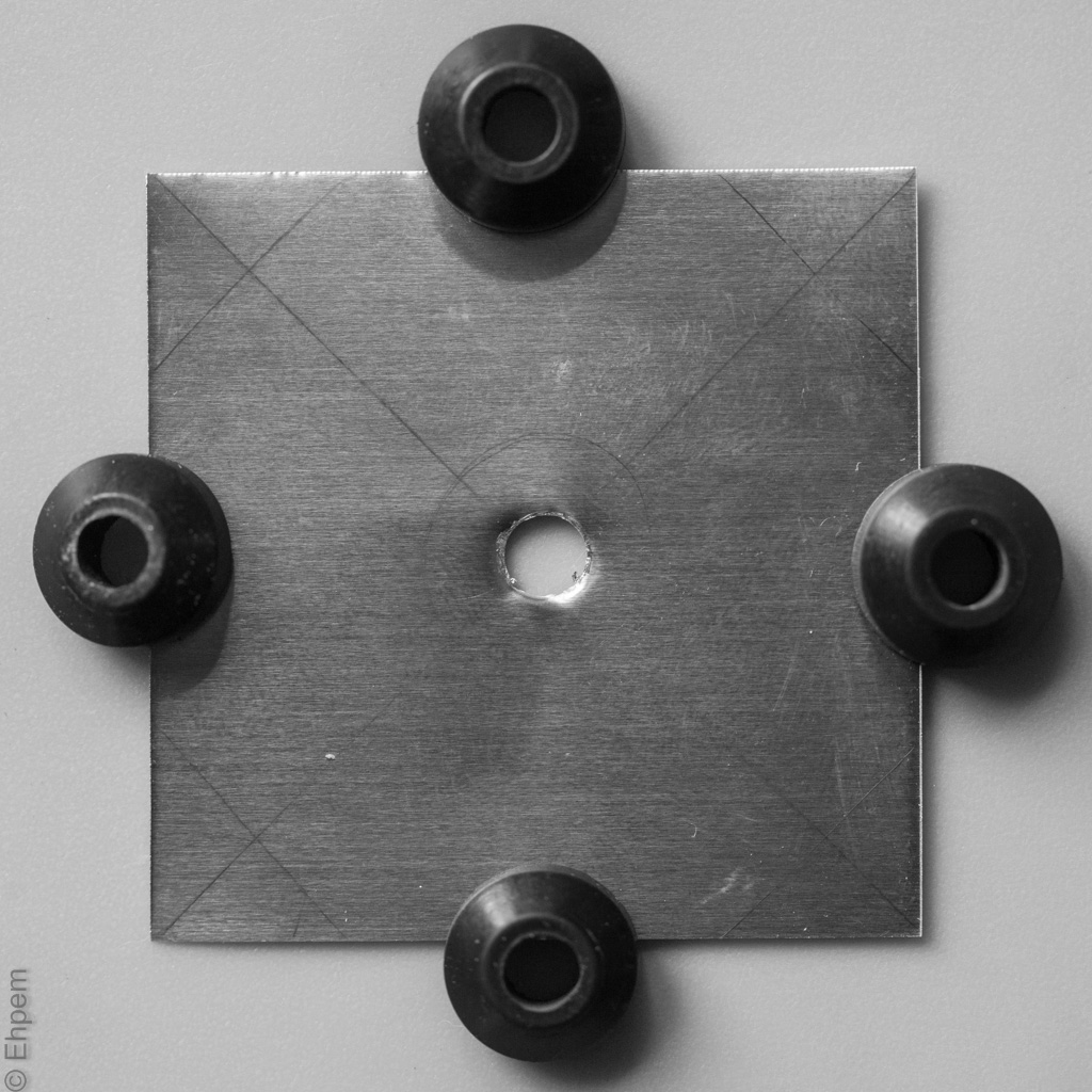 Tap washers drilled to size to support pinhole mounting plate, in approximate locations for final placement