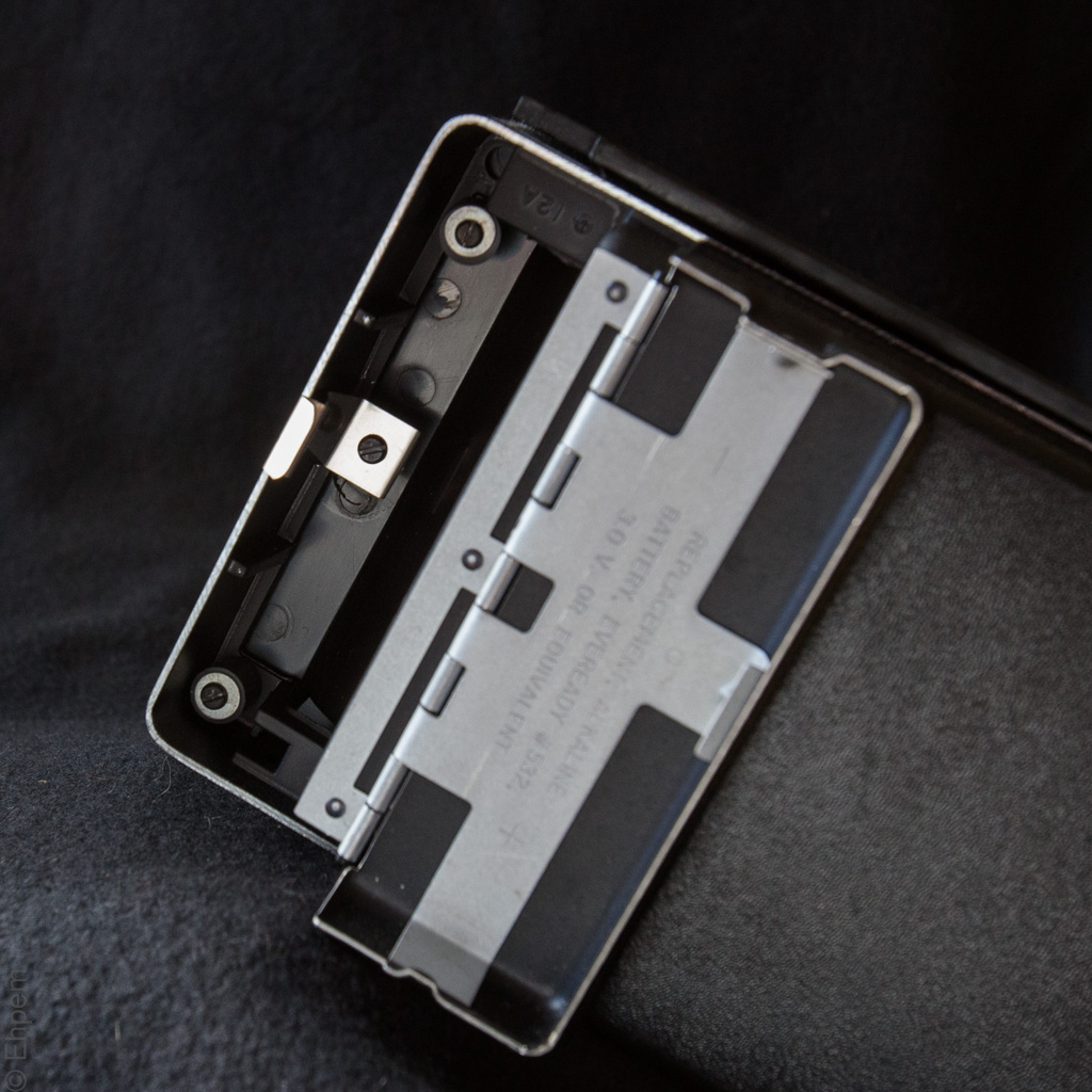 Battery compartment, useful for storing cable release and viewfinder, an exposure chart with reciprocity failure table, or a spare set of car keys!