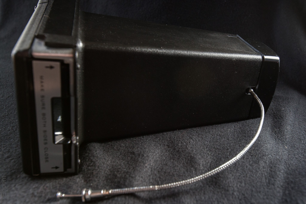 Side of camera showing cable release attachment. Also, notice the plastic flap extending over the top of the aluminum frame to hide the cut outs for Polaroid land 100 camera attachments, like the viewfinder.
