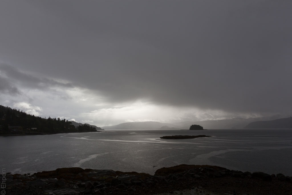 This is looking out from the Village of Queen Charlotte on Graham Island east along Skidegate Channel, with Moresby Island to the right and in the distance.