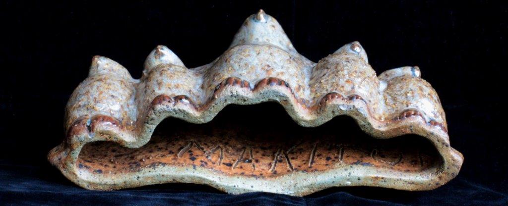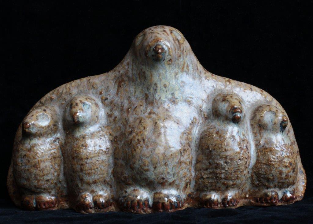 These ceramic birds was sculpted by Kingnait (Cape Dorset) artist Makituk Pingwartuk while a student at Kootenay School of Art in Nelson, BC. While we are tempted to think of them as owls, they do not completely conform to the way owls are represented and thus they may be some other species, perhaps most likely ptarmigan. Signed on the inside of base.