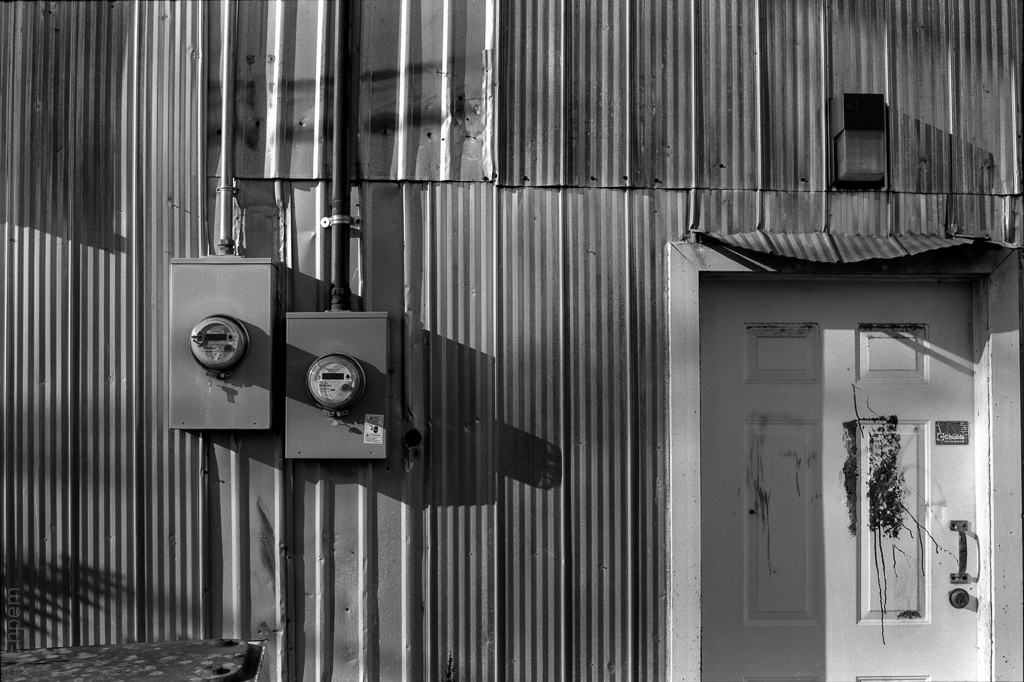 This roll of film, my 45th this year, is the last from visits to Haida Gwaii this year. Once again it is shot in the Village of Masset, but this time on Neopan Acros. I walked into this alley behind the “Christ for First Nations” church (broken windows in the church suggest it’s not going over all that well locally). The light was good and I ended up shooting half the roll on the metal siding of the commercial buildings, which is what you get today here on 52Rolls.