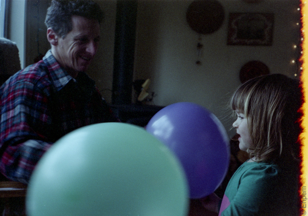 The roll of film in this camera was Fujicolor Superia X-TRA 400 and about half of the 36 frames were already shot, though I had no idea how many as the back had been opened thus resetting the counter. I took one shot in the second-hand store where I bought it, of the proprietor, and it was a double exposure over a frame that was exposed when the back was opened. Even so, there is a bit of an image there, which I have included below. The rest of the photos I took when my granddaughter came to visit for her third birthday. The better of those shots can be found at Birthday Balloons.
