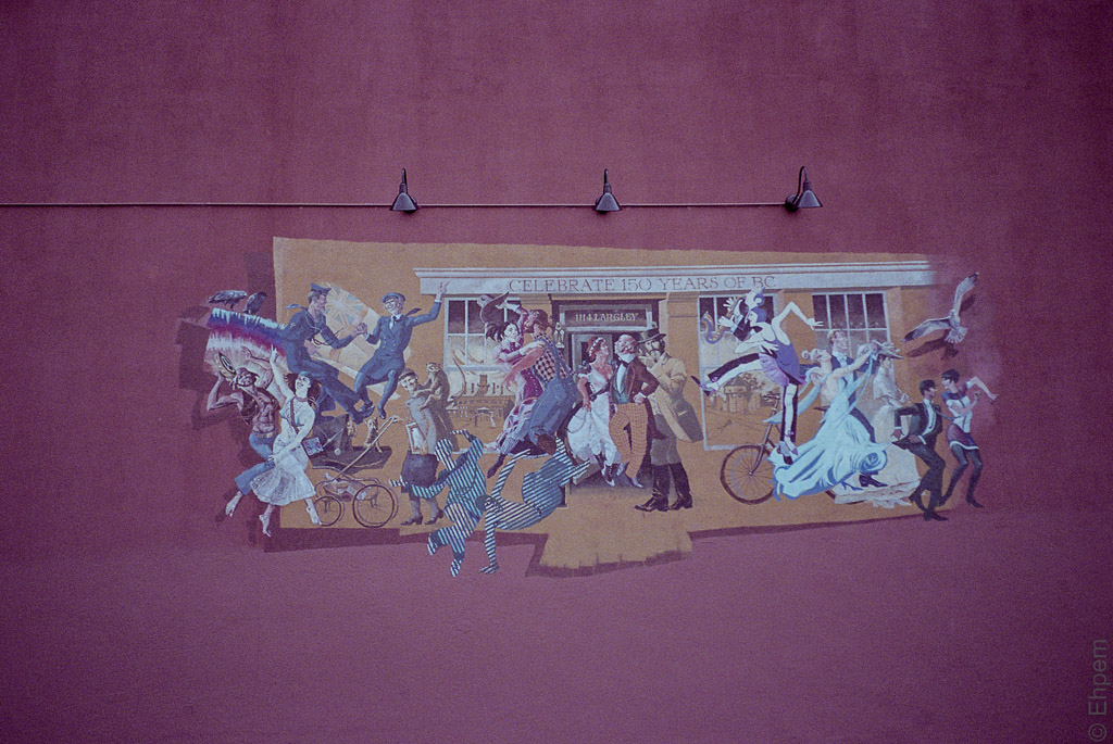 A mural in downtown Victoria. I have a post over at 52 Rolls today (here) and this mural is there too, though partially double exposed.
