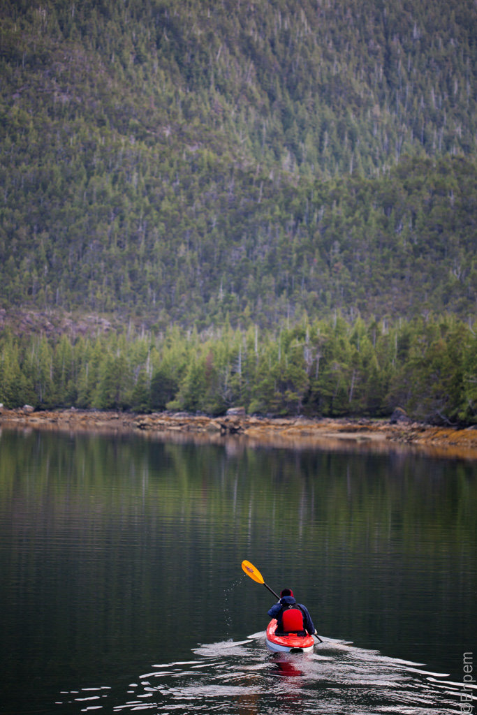 A pre-breakfast paddle out from the Passing Cloud in De La Beche Inlet.