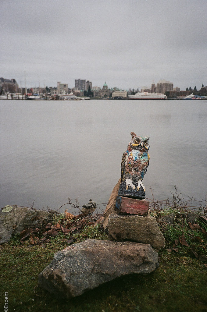 Those wacky colors and textures on the owl and the tilt make it contrast just enough with the drab shoreline. Maybe you should have asked it what it was doing there….