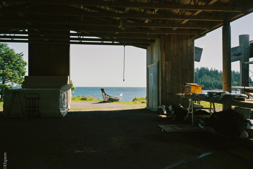 Looking out from the carving shed at the Haida Heritage Centre in Skidegate, Haida Gwaii.