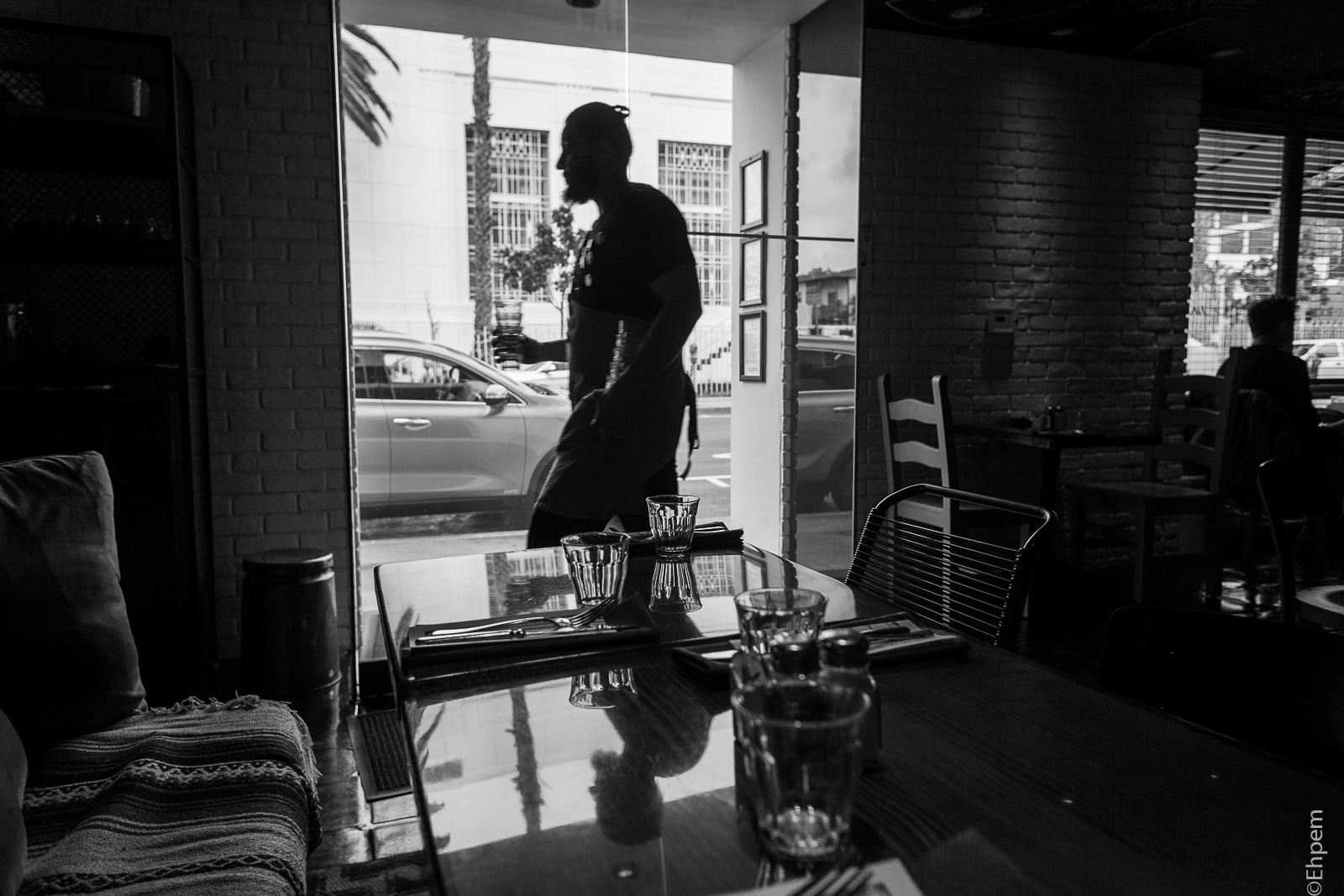 I like the stacks of glasses in this server’s arms.