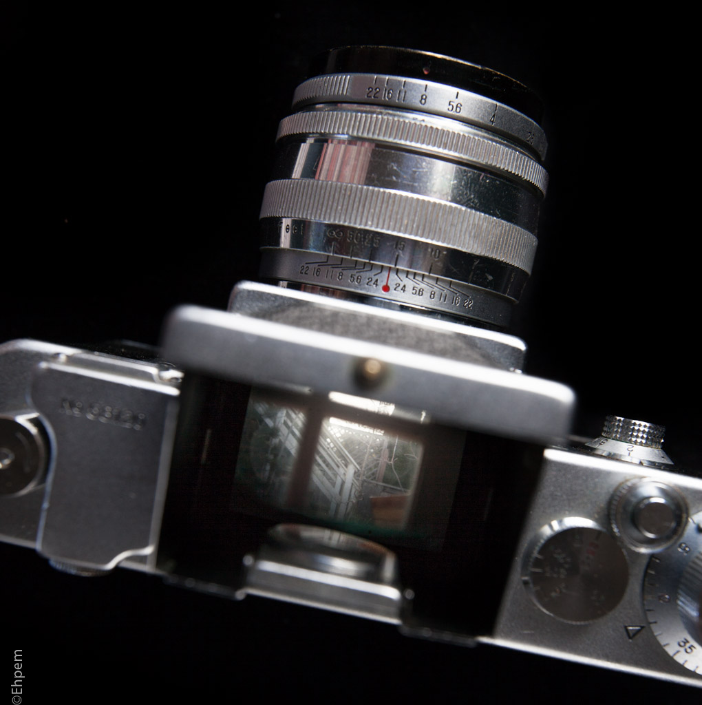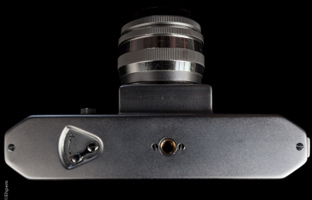 The Asahiflex cameras use 135 film which is advanced with a knob rather than a lever. There is double exposure protection, but this can be turned off by switching the film rewind lever on the bottom to “R” which disengages the film advance sprockets for however many multiple exposures you care to take. The film counter is set manually once the film is loaded.